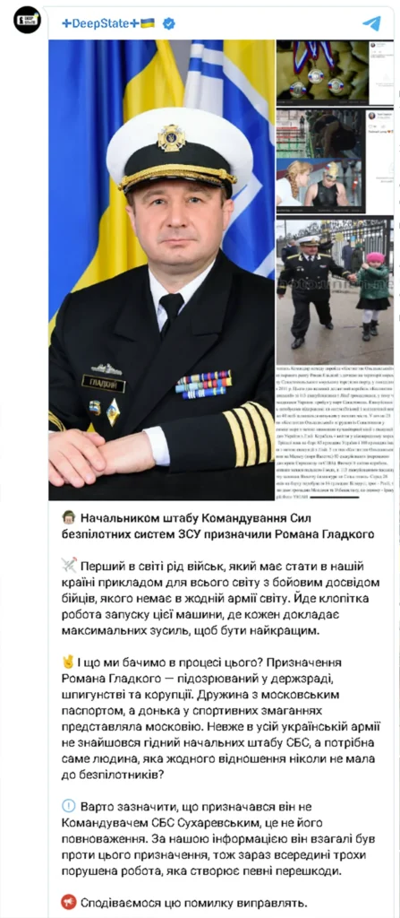 Командувач Сил безпілотних систем Вадим Сухаревський до призначення Гладкого буцімто не причетний. Він був проти цього і не має повноважень на призначення, – зазначають аналітики Deep State.
