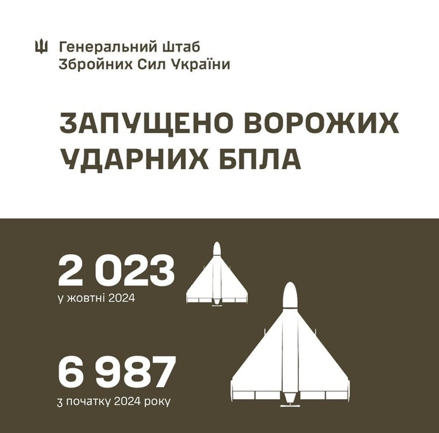 За даними Генштабу ЗСУ, у жовтні 2024 року російські окупанти запустили понад 2000 ударних БПЛА «Shahed» та інших безпілотників по Україні. З них 1185 було знищено, 738 втрачені локаційно, ще 29 вийшли з українського повітряного простору. Від початку 2024 року зафіксовано майже 7000 запущених ударних дронів, здебільшого спрямованих на цивільну та критичну інфраструктуру.