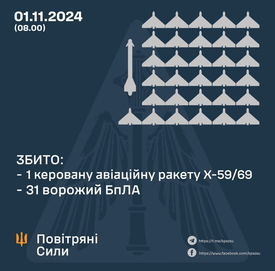 За інформацією Повітряних сил ЗСУ, станом на 08:00 1 листопада 2024 року підтверджено знищення 31 ворожого дрона, 14 безпілотників були втрачені локаційно, а ще три дрони полетіли у бік Білорусі. Також сили ППО змогли збити одну ракету Х-59/69.