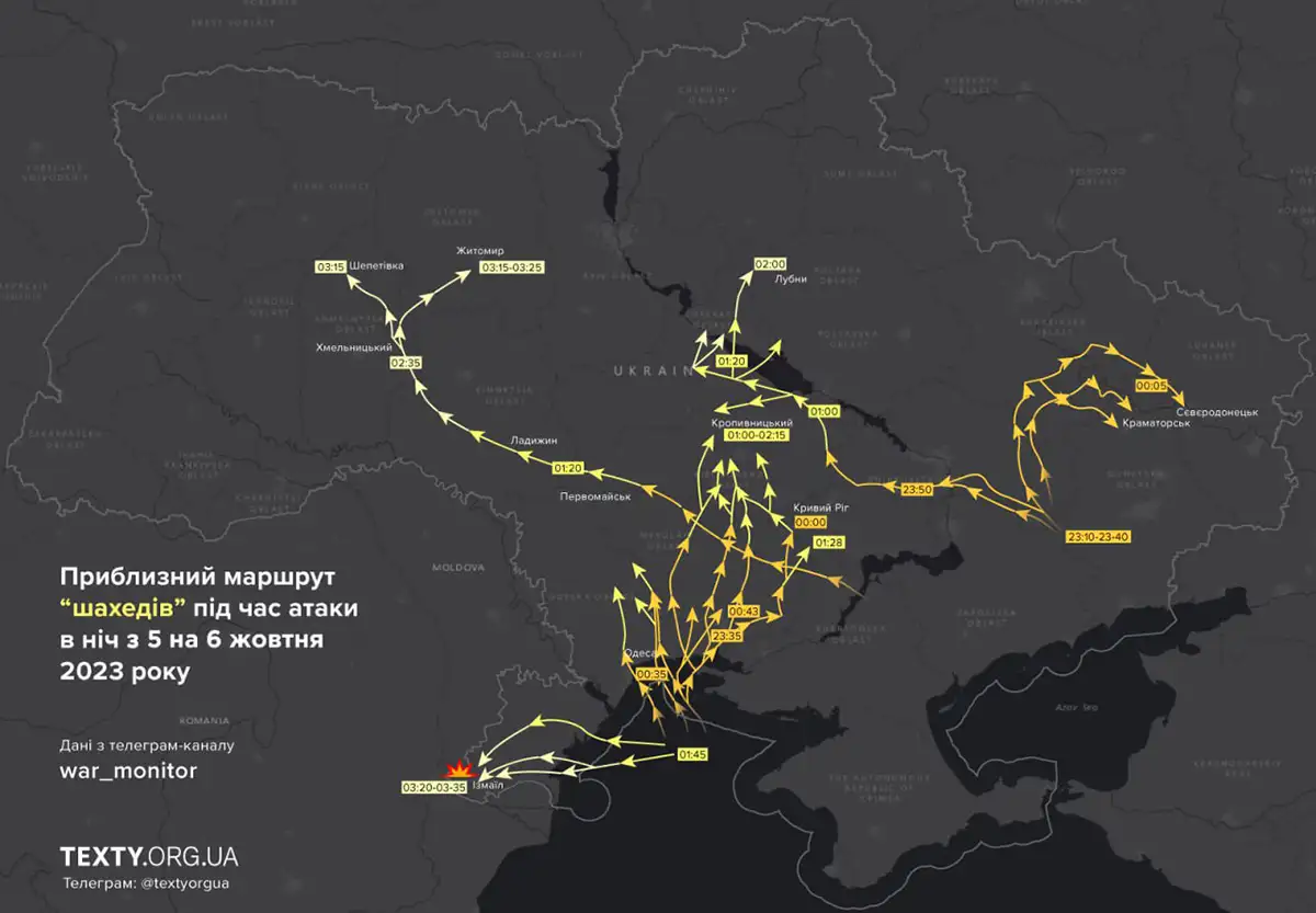 “Зафіксовано пуски 33 Шахедів, які прямували кількома групами у напрямку південних, східних та центральних областей. До відбиття повітряної атаки залучено винищувальну авіацію, зенітні ракетні війська, підрозділи мобільних вогневих груп та радіоелектронної боротьби”, – наголосили військові. “Наліт” було здійснено з мису Чауда у тимчасово окупованому Криму.