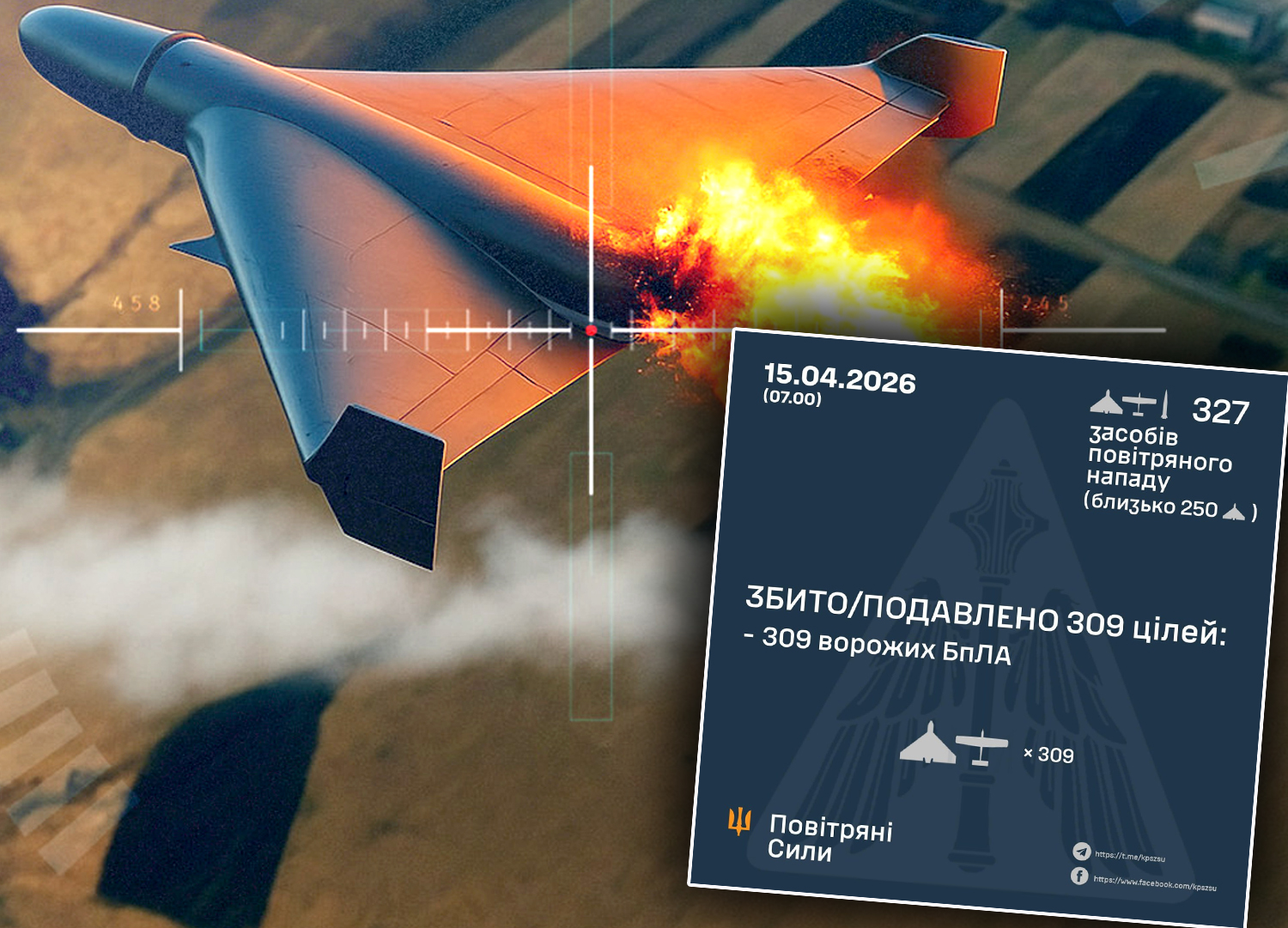 За попередніми даними, станом на 07:00 ранку захисникам українського неба вдалося збити та придушити 309 ворожих БпЛА у північних, південних, східних та центральних регіонах країни. Втім, зафіксовано влучання балістичних ракет та 13 ударних дронів на дев’яти локаціях, а в десяти місцях зафіксовано падіння уламків збитих цілей.