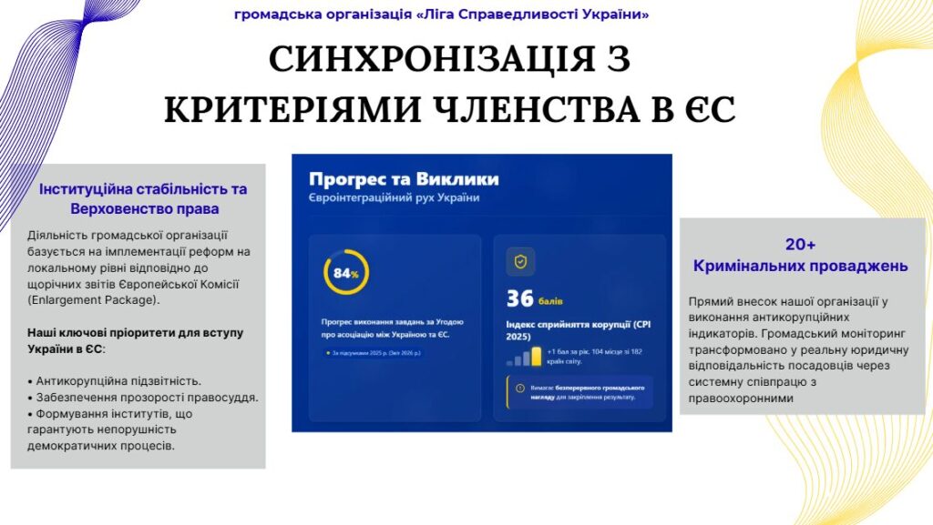 Стратегічна мета ГО «Ліга Справедливості України» — посилення готовності суспільства та місцевого самоврядування Вінниччини до життя за стандартами Європейського Союзу. Ми не просто декларуємо зміни, ми імплементуємо європейські принципи «Доброго врядування» (Good Governance) та підзвітності на практиці.