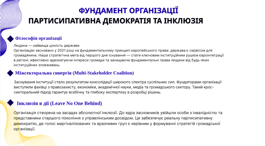 Формуючи організацію, ми свідомо відмовилися від формального підходу. Наша управлінська модель та ідеологія діяльності суворо спираються на європейське та національне правове поле. Ми керуємося принципами рівності та суспільного залучення, імплементуючи правозахисний підхід (Rights-based approach) відповідно до:
