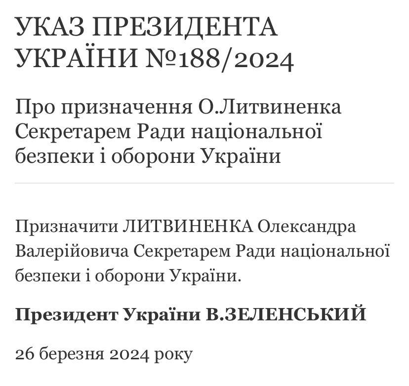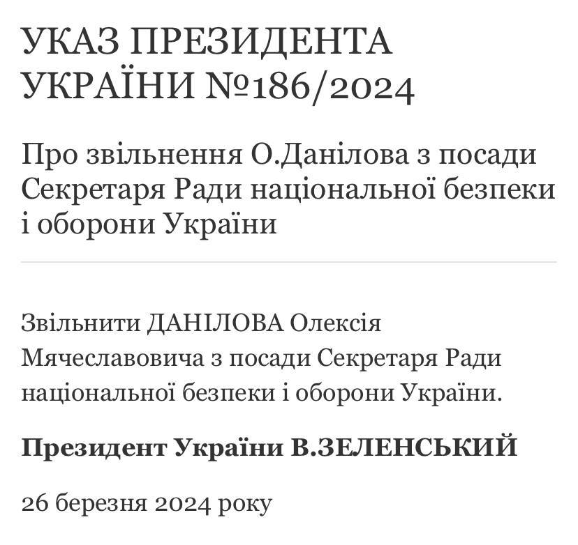 Президент Зеленський звільнив Данілова з посади секретаря РНБО і призначив на його місце голову Служби зовнішньої розвідки Литвиненка.