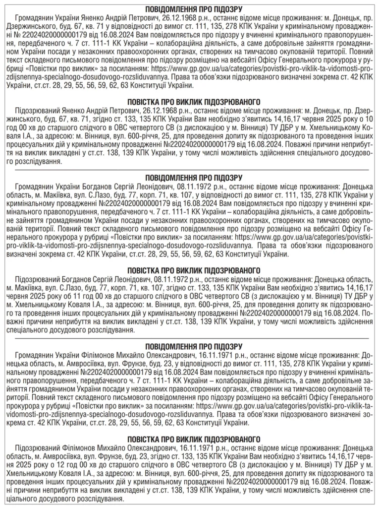За процесуальним керівництвом Вінницької обласної прокуратури трьом громадянам України висунуто обвинувачення за ч. 7 ст. 111-1 КК України у колабораційній діяльності. Підозрювані, керівники так званих Амвросіївської, Донецької та Харцизької митниць, перейшли на службу у незаконно створену «Донецьку митницю Південного територіального митного управління рф» на тимчасово окупованій території Донецької області. Про це повідомили у Офісі Генерального прокурора, пресслужба Вінницької обласної прокуратури та речники Територіального управління Державного бюро розслідувань (ДБР) у м. Хмельницькому.