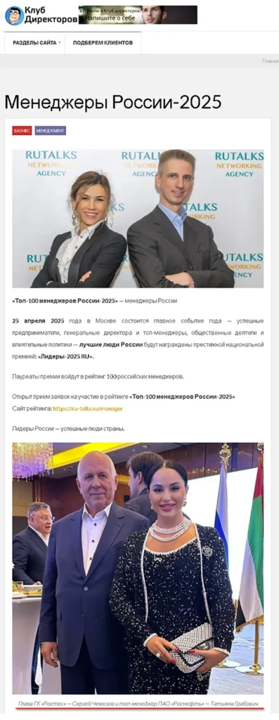 Довгий час було не зовсім зрозуміло, хто цю пустоголову» кандидатку юридичних наук» з силіконовими губами працевлаштував у центральний офіс головної російської нафтогазової компанії «Роснефть». Аж поки її демонстративно не почав вигулювати по Москві гендиректор корпорації «Ростех» Сергій Чемезов. Він – олігарх, генерал-полковник, член бюро вищої ради партії «единая россия», близький соратник кремлівського фюрера путіна та один із стовпів путінського режиму.