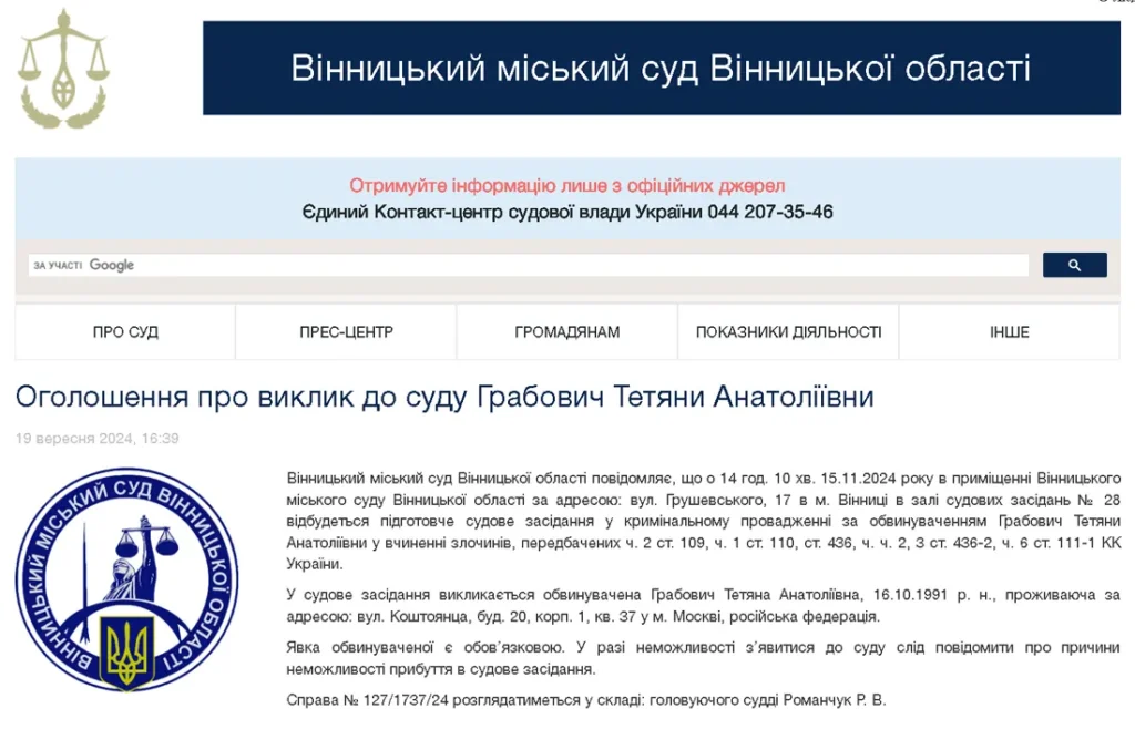 Вінницький міськсуд викликає 33-річну уродженку Вінниці, нині жительку Москви Тетяну Грабович. У суді щодо зрадниці України розглядається обвинувачення за п’ятьма статтями Кримінального кодексу України, їй інкримінують заклики до повалення конституційного ладу в Україні, здійснення інформаційної діяльності на підтримку держави-агресора, пропаганду війни та звеличення окупантів (ч. 2 ст. 109, ч. 1 ст. 110, ст. 436, ч. 2 ст. 436-2 та ч. 6 ст. 111-1 КК України).