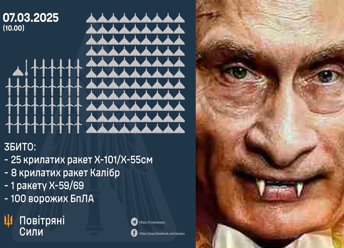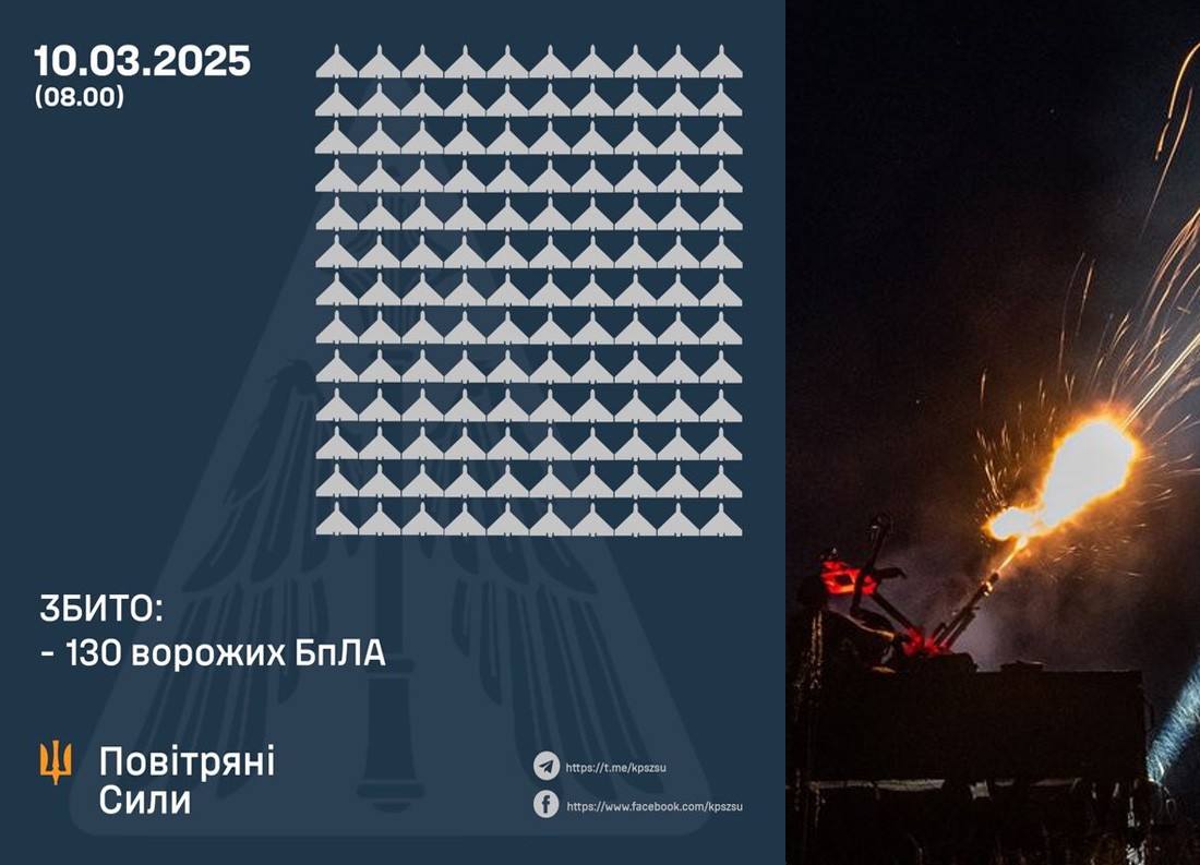 У ніч на 10 березня 2025 року російські окупаційні війська здійснили чергову масовану атаку на Україну, застосувавши 176 ударних безпілотників «Shahed» та дрони-імітатори різних типів. За даними Командування Повітряних Сил ЗСУ, українські сили протиповітряної оборони знищили 130 ворожих дронів, а ще 42 безпілотники-імітатори не досягли своїх цілей і були локаційно втрачені. «Повітряний напад відбивали авіація, […]